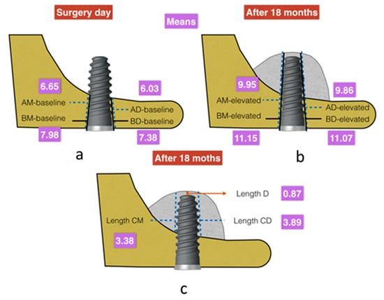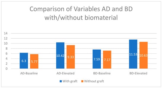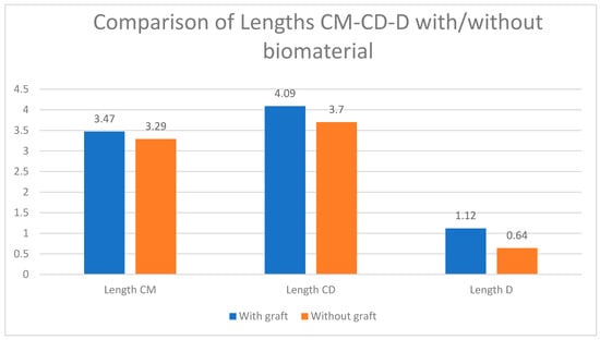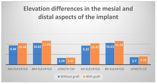 By individually analyzing all the elevated lengths, in radiographs analyzed 18 months after implant placement with elevation, we found that all variables had higher values in the group with biomaterial (Figure 2). These values observed were the highest distal to the implant. The BD-elevated length (10.63 mm in the control group and 11.53 mm in the test group) and the CD length (3.70 mm in the control group and 4.09 mm in the test) presented the greatest differences (Figure 4 and Figure 5). All the variables analyzed were normally distributed except for BM-baseline, AD-elevated, BD-elevated, and length D. Student’s t-test was used to compare the normally distributed variables, this showed statistical significance for all at 18 months (p < 0.005). The four non-normally distributed variables were compared by the Mann–Whitney U-test for independent samples, and only length D showed statistically significant differences (p < 0.005).