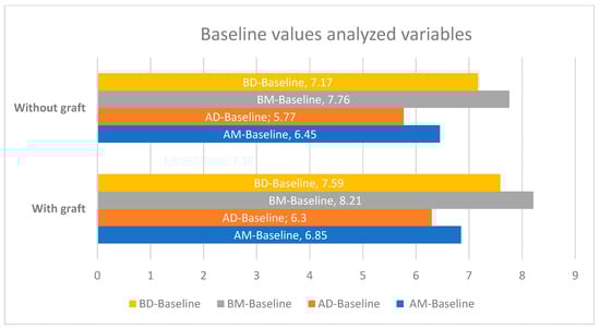 In this study, minimum baseline cortical values (AM-baseline) of 6.65 ± 1.32 mm (95% CI −0.36, 1.16, p = 0.299) mesially and 6.03 ± 1.42 mm distally (AD-baseline) (95% CI −0.3,1.23, p = 0.263) were obtained (Table 1 and Figure 2). There were no statistically significant differences in variables between the test and control groups. There were also no differences if the implant shoulder was taken as a reference mesially (BM-baseline) (7.98 mm ± 1.35, 95% CI −0.3,1.23, p = 0.263) or distally (BD-baseline) (7.37 mm ± 1.41, 95% CI −0.39,1.24, p = 0.292).
