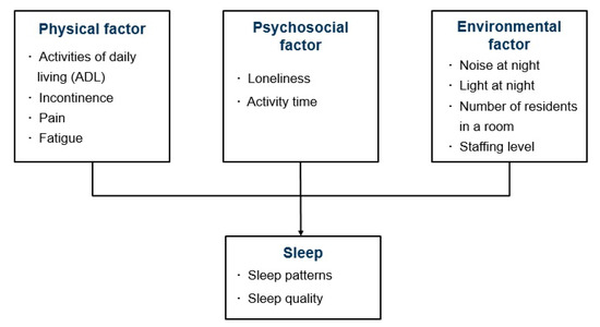 The senescent sleep model explains the mechanisms underlying sleep complaints among community-dwelling older adults [7]. According to the model, sleep disturbances can be caused by predisposing, precipitating, and perpetuating factors. Predisposing factors include changes in sleep–awake physiology due to the normal aging process. Precipitating factors include physical impairments that increase with aging. Perpetuating factors include psychosocial problems that persist sleep complaints. The conceptual framework of this study was developed to study influencing factors on sleep patterns and sleep quality in older adults living in long-term care facilities by modifying the senescent sleep model based on the literature review (Figure 1). In this conceptual framework, physical factors corresponding to the precipitating factors of the senescent sleep model consist of the activities of daily living (ADL), incontinence, pain, and fatigue [5,15]. Psychosocial factors, corresponding to the perpetuating factors of the senescent sleep model include loneliness, which is a perceived subjective feeling of being isolated [16], and activity time [7]. Environmental factors are also included in this conceptual framework since older adults who reside in a shared group residence facility can be more likely to be exposed to external environmental characteristics which can disrupt sleep. Noise and light at night, number of residents in a room, and staffing levels at night were studied as possible environmental factors [6,10,17].