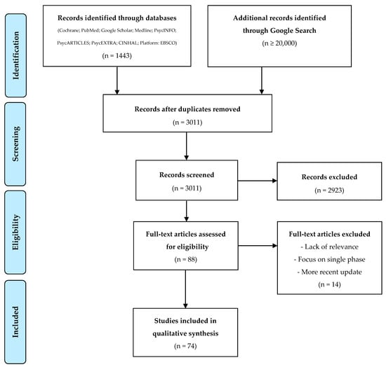 As shown in Figure 1, over 1446 records were identified through database searches. Additionally, 1568 records were identified using Google searches following removal of duplicate records. From these records, 88 appeared relevant to the purpose of this review during examination of titles, abstracts, or descriptions and were selected for full-text review. During full-text review, 14 records were excluded due to lack of relevance to the topic, a focus primarily on a single phase of disaster response, no explicit reference to DRR related concepts, or the identification of a more recent update of the same publication or material. See Figure 1 for a diagram displaying the search process.