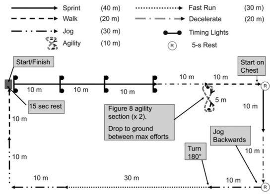 The team sport simulation circuit (TSCC) used was based on previous research examining the validity and interunit reliability of different GPS systems in football [22,23,25]. The TSSC was designed to replicate the real movements and physiological requirements of football team patterns, and contained components of standing, walking, jogging, running and sprinting along with accelerations and decelerations. In addition, this protocol has been previously used in other sports such as field hockey [28] or Australian football [29]. Additionally, the TSSC was designed to assess the capabilities of GPS when measuring movement demands at speeds in excess of 20 km·h−1. The procedure of this test was described previously by Johnston et al. [25] (Figure 1). Participants were required to complete eight laps of the TSSC, resulting in a total distance of 1320 m, which is comparable with previous examinations into GPS and movement demands [5,30]. It was found that each lap was finished within approximately 1 min, with participants provided with a 15-s rest at the start of each subsequent lap. This meant that testing maintained a similar intensity to team sport matches [31].
