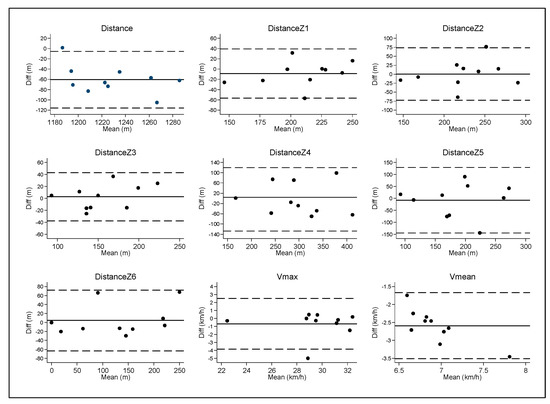 The same variables, according to previous studies [20], were obtained from both systems: total distance (TD, distance covered by the player throughout the test independent from the speed at which players were moving); distance in zone 1 (DZ1, distance in metres covered by the player at a speed lower than 4.00 km·h−1); distance in zone 2 (DZ2, distance in metres covered by the player at a speed of between 4.00 and 7.99 km·h−1), distance in zone 3 (DZ3, distance in metres covered by the player at a speed of between 8.00 and 13.99 km·h−1) distance in zone 4 (DZ4, distance covered in metres by the player at a speed of between 14.00 and 20.99 km·h−1); distance in zone 5 (DZ5, distance in metres covered by the player at a speed of between 21.00 and 23.99 km·h−1); distance in zone 6 (DZ6, distance in metres covered by the player at a speed equal to or greater than 24.00 km·h−1), maximum speed (Vmax, peak height velocity achieved by the player, recorded in km·h−1), and average velocity (Vmean, average velocity by the player throughout the test, recorded in km·h−1).