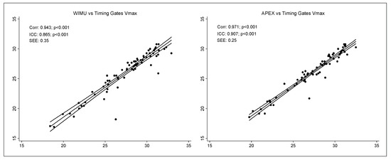 Figure 3 shows the product−moment correlation between both systems and the gold standard measurement: timing gates in Vmax values. The Wimu (0.943) and Apex (0.971) systems present nearly perfect values, with high (Wimu = 0.865) and very high (Apex = 0.907) ICC values for Vmax.