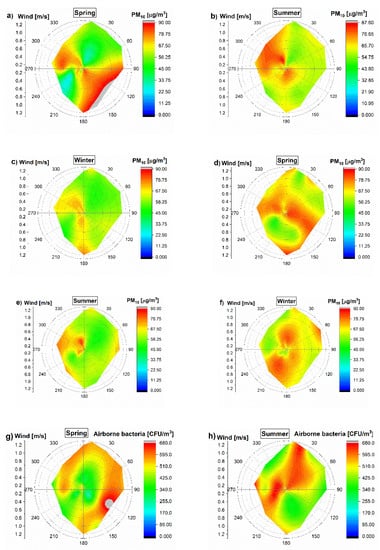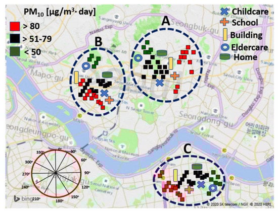 Figure 1 presents the plots of PM10 concentration determined using the R statistical software. Outdoor PM10 concentrations are presented as three categories based on the concentration values. As shown in Figure 2, the average PM10 concentrations (24 h) with wind speed and direction were presented as well. The average PM10 concentrations ranged from 42.76 to 82.1 μg/m3 in all outdoor environments of the childcare, school, commercial building, elderly and homes.