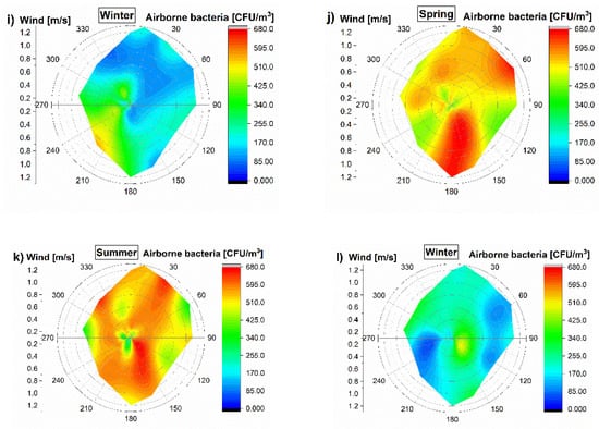 Polar contour maps for the concentrations of outdoor aerosol (PM10 and airborne bacteria) as a function of wind speed and direction. (a–c), (g–i) are investigated for 20 days in 2015; (d–f), (j–l) are investigated for 27 days in 2016. These data were obtained during the normal sunny days in each season.