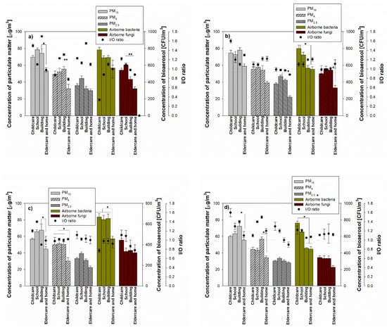 For bioaerosol concentrations, airborne bacteria showed the highest concentrations in childcare facilities (799.4 ± 39.9 CFU/m3 in summer) in all seasons, while airborne fungi showed high concentrations (602.3 ± 24.5 CFU/m3) in school during summer. In addition, PM4 showed significant differences in concentrations in commercial buildings, elderly and homes in all seasons, and airborne bacteria and fungi also showed significant concentration differences in sampling locations (p < 0.05).