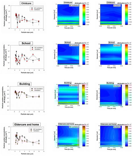 Size distributions of indoor particles in different places (childcare, school, commercial building, elderly facility and homes) and their variation with time as a function of ventilation. The data present averages of three repeats.