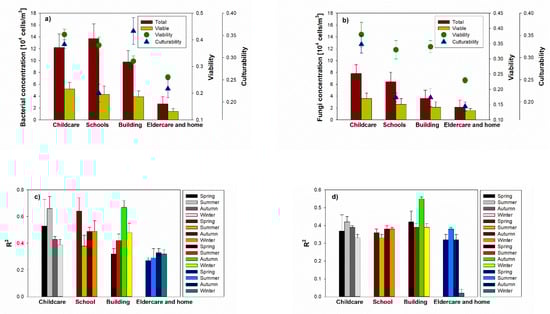 Concentrations of total bioaerosols, viability, culturability and the relationship between PM and viable bioaerosol observed in different indoor environments (childcare facility, school, commercial building and elderly and homes). (a,b) calculated viability and culturability for bacteria cells and fungal cells, respectively and (c,d) a linear relationship with coefficient of determination (R2) between viability and culturability for bacterial cells and fungal cells, respectively.