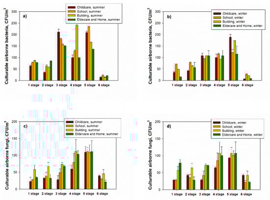 Culturable airborne bacteria (a,b) and fungi (c,d) during summer and winter seasons in different environments (childcare facilities, schools, commercial buildings and elderly and homes) using the six-stage Anderson impactor.