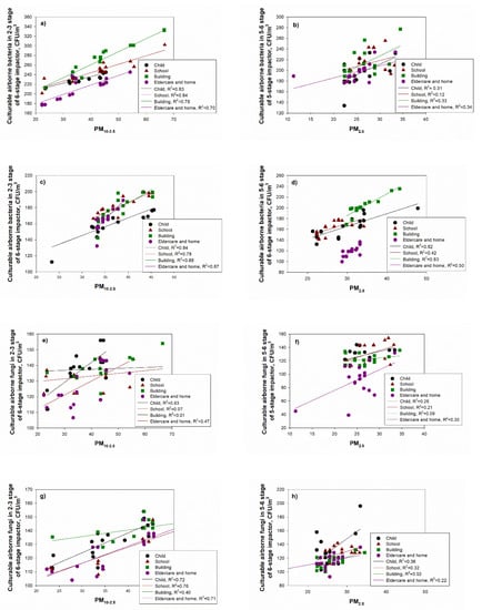 The childcare facilities have led the way in demonstrating many of the links between environmental exposures and health outcomes. Some bioaerosols could also be adsorbed to the inhalable aerosols and transported in environments that have potential pollutant sources [,,]. This study showed that PM concentrations, especially respirable-sized PM, are related to the culturable bioaerosol based on the size-selective concentration. In addition, the coefficient of determination between PM and bioaerosol (Figure 7) was over 0.7, and PM2.5 was even correlated with bioaerosols in some environments (childcare facilities and commercial buildings) (R2 = 0.8), indicating that a higher PM concentration could lead to the increase of bioaerosol concentration, causing respiratory diseases.