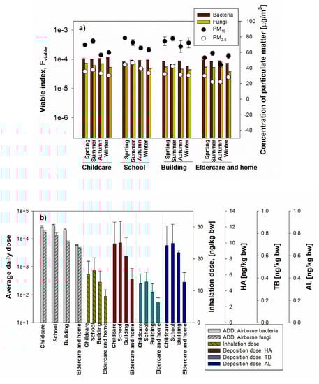 It is often difficult to determine the extent to which the environment contributes to human health. In addition, the control of respirable-sized aerosols in PM and bioaerosols should be required considering the exposure environments, age, and a potential source of pollution [,,]. Moreover, the viability could be an important tool in the evaluation of the health effect when indoor pollutant factors and/or sources were considered.