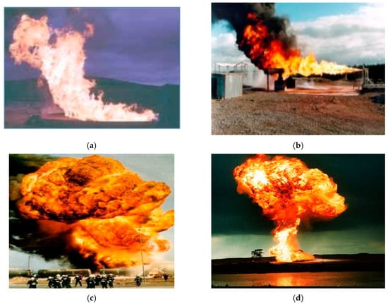 Example of each fire explosion case: (a) pool fire, (b) jet fire, (c) boiling liquid expanding vapor explosion (BLEVE), and (d) vapor cloud explosion (VCE).