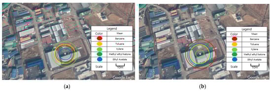 In particular, the above-mentioned chemicals of benzene, toluene, xylene, ethyl acetate, and methyl ethyl ketone also differ in the designated quantities of each chemical, ranging from 10,000 to 200,000 kg. Despite similar physicochemical properties, the difference in designated quantities is more than 20 times the risk application in terms of chemical accident prevention [,]. Therefore, in this study, the modeling is based on the assumption that a chemical accident has occurred for these five substances, and compared with the specified quantity in other countries, the study intends to present the designated quantity of each chemical as conservatively as possible.