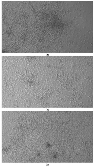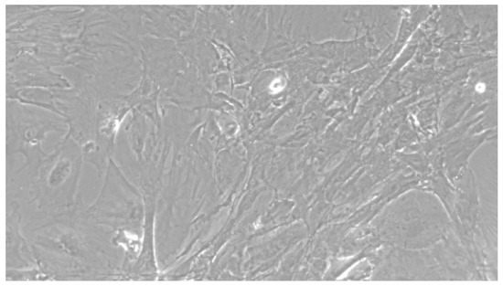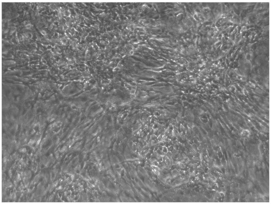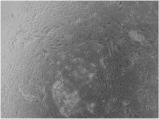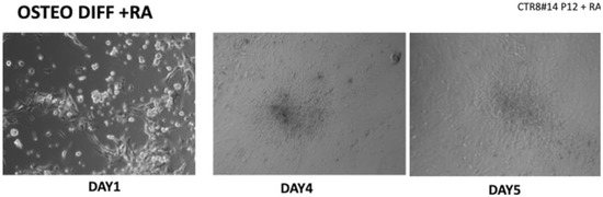 When the EBs were coated, confluence was expected at 70–80% (Figure 1a–d); in CTR8#P12, since it was the most copious clone, retinoic acid was added as described previously (Figure 2) [16]. From the phase microscope images, we observed that, in the first days of differentiation, the speed of expansion and differentiation was faster (Figure 3), which then appeared to slow (Figure 4). CTR4#5 P20, as shown in the microscope images (Figure 5), followed a different trend: its structure was more streamlined than the other clones, and even the phyllopod-connecting structures typical of the morphology of osteoblasts appeared different. CTR8#14 P12 without retinoic acid immediately showed a concentric differentiation, then in the typical form of osteoblasts, and then the clone developed real areas of osteogenesis with the formation of osteons, confirmed by alizarin testing and alkaline phosphatase (Figure 6a–c).