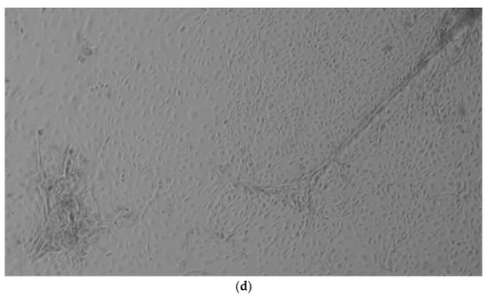 HiPS stem cells are coated as EB ((embryoid bodies) mandatory step before differentiating into osteoblasts), when they reach confluence; i.e., a situation in which they no longer have space to grow They then move on to the phase of differentiation in the osteoblastic sense, thus changing the type of medium. (a) CTR2#6 P19 (one of four clones) reached confluence (70–80%) on day 12 (magnification 10×, plates 70,000 cells); (b) CTR4#5 P20 reached confluence (70–80%) on day 21 (magnification 10×, plates 70,000 cells); (c), CTR8#14 P12 + RA reached the confluence (70–80%) on day 21 (magnification 10×, plates 70,000 cells); (d) CTR8#14 P12 - RA reached confluence (70–80%) on day 6 (magnification 10×, plates 70,000 cells).
