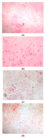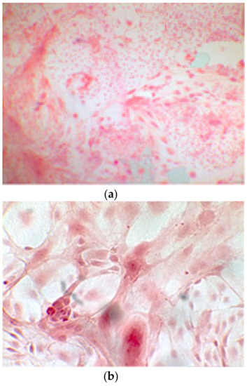 The alizarin test was performed at 14, 21, and 28 days depending on the number of cells available for each clone. In the first images processed under the microscope after staining with alizarin, we observed that the clones were positive for the alizarin test after 14 days, so the partially differentiated cells included calcium (Figure 7a–e). Even CTR4#5 P20, which had a different coloring from the others, showed areas of positivity at 14 days (Figure 8). At 21 days, positivity was maintained, as can be seen from Figure 9a–e. In particular, CTR8#14 P12 at 28 and 35 days exhibited a much more organized structure with less staining, but this was only due to the cells, compared with the first test, having a limited and organized structure (Figure 10).