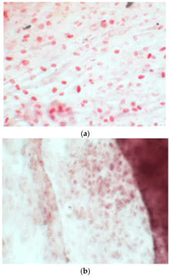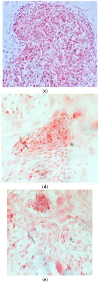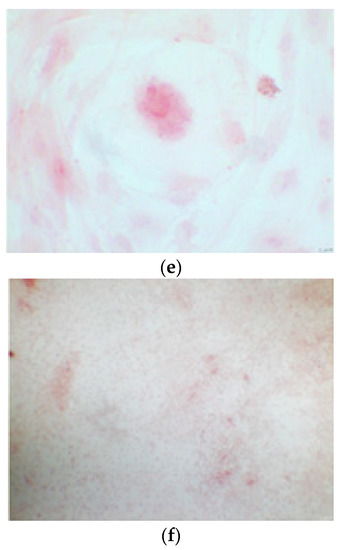 The alizarin test at 21 days confirmed the positivity of samples of calcium deposits, highlighted by red coloration. Compared to 14 days, a more organized structure is evident; we can see this from a smaller red coloration, but precisely because it is more compact and delimited to the cell nucleus. We see CTR2#6 P19 (a,b), CTR8#14 P12 – RA (d,e), CTR4#5 P20 (c).