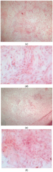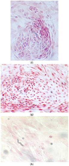 Since the first images processed under the microscope after staining with alizarin, we see that those after 14 days are positive to the test of alizarin, so the partially differentiated cells include calcium. We have one image for control CTR2#6 P19 (a), five images for CTR8#14 P12 – RA (b–f) control, being the best clone, and one image for control CTR8#14 P12 + retinoic acid (g).