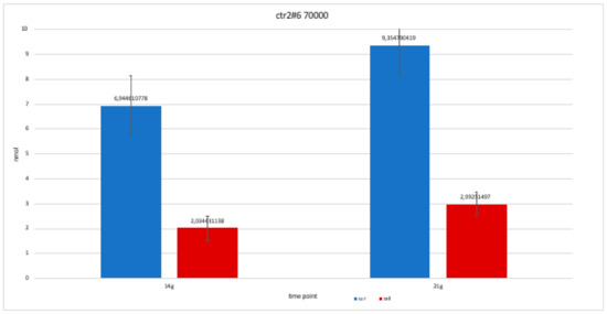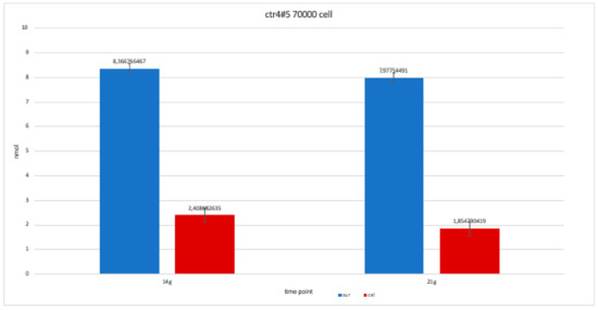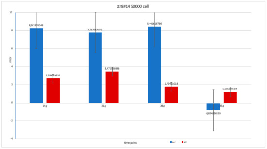 Level of alkaline phosphatase contained in clone in clone CTR8#14 P12 – RA, plated on 50,000 cells for well, showing a fairly balanced trend, except at 35 days when there was an error in the collection of the soil; therefore, this is a bias due to the operation itself.