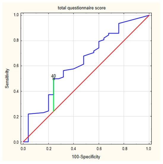 | Total questionnaire score | 0.026153 | 0.012898 | 4.1117 | 1.0265 | 1.0009–1.0528 | 0.0426 |