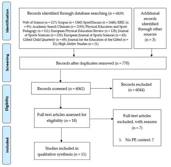 A total of 11 studies were conducted internationally (see Supplementary Material, Table S1: Synthesis of studies about talent identification in Physical Education), from the first one [] to the last one []. The relevant information was assessed following the structure used in previous SR []: ‘author(s)’ (and publication year); ‘focus’; ‘sample description’; ‘analysis/data sources’; and ‘outcomes’. A summary table with all the studies has been added as a supplementary material. Figure 1 shows the diagram flow followed during the search process.