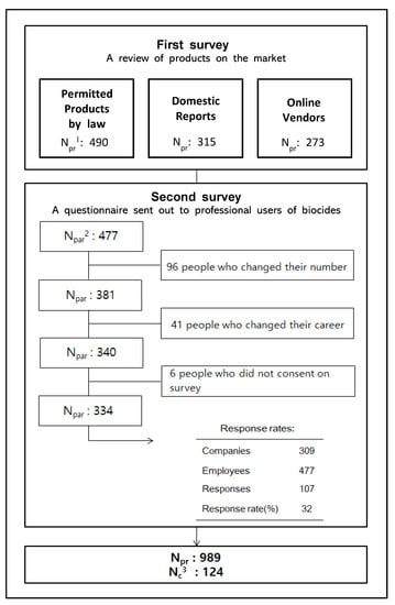 In order to survey current usage, it is the most accurate way to obtain information on the products and ingredients sold by companies currently handling biocides. Also, a preliminary research on existing products is cost-effective method. Therefore, data were collected in two stages: a first survey and a second survey (Figure 1). Through this method, we aimed to comprehensively identify the products known to be used and to investigate all of the currently used biocides in Korea.