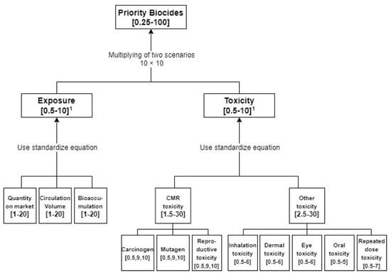 Meanwhile, it is well known that biocides remain in the body even after using a product due to its high bioaccumulation []. Therefore, bioaccumulation corresponding to the mobility/distribution group was selected as an indicator of exposure. In EURAM, log Kow in the physical properties group was used as an indicator of distribution in the body. EURAM gave a score of 0.25 if log Kow is greater than 3 and 0 if log Kow is lower than 3 []. In this study, as biocides are highly bioaccumulative in the living organisms, the values of log Kow were mostly over 3, higher than for general chemicals, and were in the range of −10.17 to 8.6. Therefore, bioaccumulation was divided into four classes based on Criterion 1 of “Introduction to Environmental Toxicology,” Criterion 3 of EURAM, and Criterion 5 of the Soil and Sediment Risk Assessment Process for Biocides of the EU. The reason for dividing into four classes is to avoid overweighting scores by subdividing the interval between grades. All three indicators had the same weight, and scores were also given in the same way.