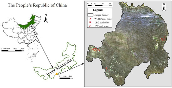 The study area extends for 7.55 × 103 km2; it is located in Jungar Banner (39°16′–40°20′ north (N), 110°05′–111°27′ east (E); 1100–1250 m above sea level (a.s.l.)), in the eastern part of the Inner Mongolia Autonomous Region, China. The topography is high in the northwest and low in the southeast. The main topographic features include arsenic sandstone, aeolian sand, and loess gully. The mineral resources are distributed mainly in the western, southwestern, and eastern parts of Jungar Banner, with barren land and a fragile ecological environment. The study area is characterized by a semi-arid climate with uneven precipitation distribution, mainly concentrated in the summer. The average annual precipitation is 408 mm, while the average annual evaporation capacity is about 2100 mm. The annual average temperature is 7.2 °C. The Yellow River is the largest surface water body in Jungar Banner. It is not only a regional discharge channel of surface water and groundwater, but also the supply source of groundwater in this area. Jungar Banner is a national comprehensive energy base, characterized by a high-intensity, large-scale coal exploitation. We selected a mine in each mine group for field experiments (A: WLHD coal mine, B: LLG coal mine, C: JZT coal mine; Figure 1).