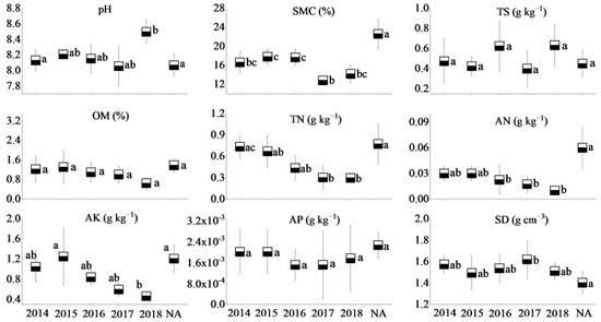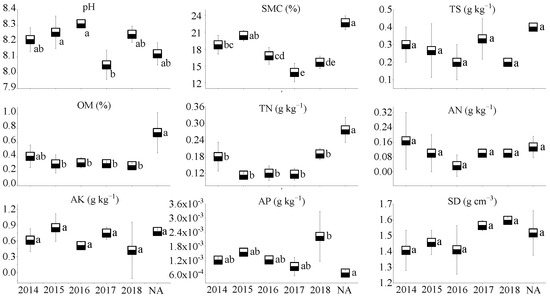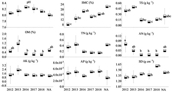 Plant surveys were conducted in each plot. All the plants in a plot were recorded and identified at the species level, according to Chang and Liu [46]. We recorded the plant species (SP), the total number of plants (NP), and the terrain and environmental characteristics provided by the Environmental Restoration and Management Center of the Jungar Banner mining area. We used a combination of parameters representing plant diversity, such as the Shannon–Wiener index (H’) to reflect relative abundances, the Simpson index (D) to measure dominance, the Pielou index (J) to express evenness, and the Margalef index (Mg) to reflect richness. These methods were described according to Tsafack [47]. Prior to sampling, the litter layer was removed, soil samples were collected at a depth between 5 and 30 cm, and each sample was composed of four subsamples from the center point and the surrounding area. Immediately after collection, the samples were mixed and placed in an aseptic bag (about 50 g). Soil moisture content (SMC) was measured in the field using an ML3X soil moisture tester (Delta-T, Inc., UK), with three replicates at each sampling site [48]. Soil bulk density (BD) was measured using the ring-cut method (cutting ring size: diameter 50.46 mm, height 50 mm). Except for soil moisture content and soil bulk density, all soil chemical properties were measured in the laboratory. Total salt content (TS) was measured through the residue drying–quality method. Soil organic matter (SOM) was measured using the method of potassium dichromate; soil pH was measured with a pH meter (Origin Research Inc.); total N was determined with the salicylate–hypochlorite method, using a SANplus Segmented Flow Autoanalyzer (SANplus) after semi-micro-Kjeldahl [23]; available N and P were determined using the alkaline hydrolyzation diffusion method and the 0.5 mol/L NaHCO3 extraction-Mo-Sb colorimetric method, respectively. NH4OAC extraction–flame photometry was used to detect available K [49]. All methods followed those described previously [50].