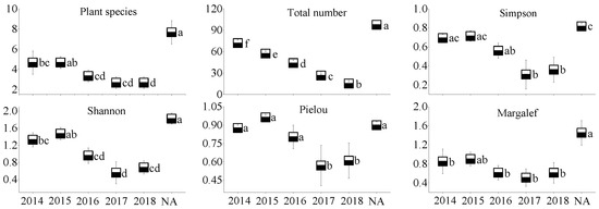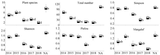 Moreover, all the plant community parameters in the NA of the three coal mines were the highest, except for the Pielou index in the three coal mines and for the Margalef index in the JZT coal mine. Basically, all the parameters, except the Pielou index in the newly rehabilitated area (RA18), were less than 50% of those in the NA. Over time, the gap between parameter values will gradually narrow.
