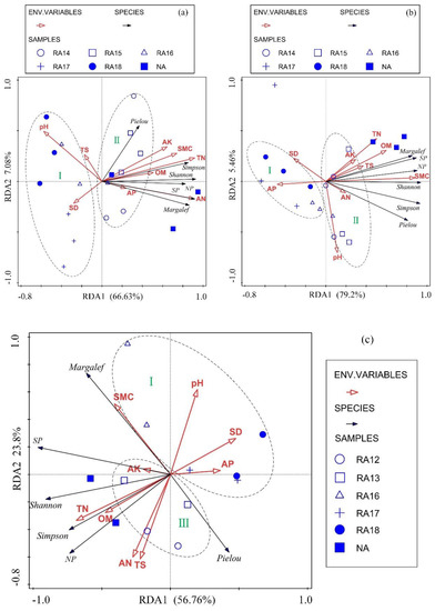 Multivariate statistical analysis was performed to explore the relationship among plant community characteristics, soil properties, and sample plots using the Canoco 5. Software (Center for Biometry, Wageningen, the Netherlands). To determine the best analytical model (i.e., the linear model or the unimodal model), the species data were analyzed through a detrended corresponding analysis (DCA) prior to the analysis. Canoco 5 (through its Canoco Adviser) can suggest the choice of the appropriate analysis model [51]. In this study, the statistical significance (at the 5% level) of relationships between plant community characteristics and soil properties was assessed using the Monte Carlo test on 499 random permutations to test the null hypothesis that the plant community was unrelated to environmental variables [52,53].