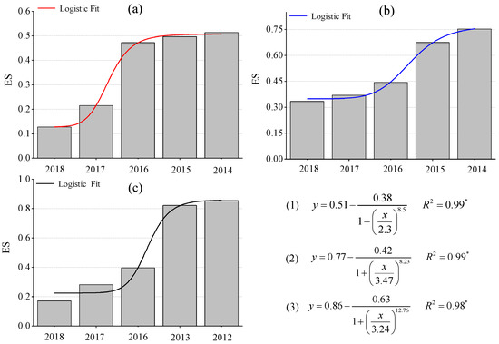 Change law of ecological stability of the refuse dumps in different coal mine areas across different restoration ages; y represents the value of ES and x represents the restoration time; equation (1) represents the logistic succession model of ecological stability in WLHD coal mine, equation (2) represents the logistic succession model of ecological stability in LLG coal mine, and equation (3) represents the logistic succession model of ecological stability in JZT coal mine (* p < 0.05, (a) WLHD coal mine; (b) LLG coal mine; (c) JZT coal mine).