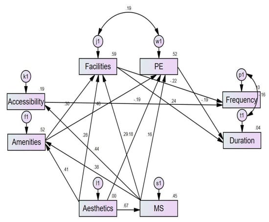 The reliability test is carried out by Cronbach’s α coefficients, and it is calculated as the whole scale and each group. All α coefficients are greater to 0.8 (0.809~0.957). It means that the reliability of the whole scale and each group are all significant. The construct validity of the questionnaire is analyzed by exploratory factor analysis. Kaiser–Meyer–Olkin measure and Bartlett’s test of sphericity (KMO = 0.928, Sig = 0.000) indicates that the validity of the questionnaire is suitable for further analysis. According to the past study achievements, the research made an assumption of the influence of facilities (I1), accessibility (I2), PE (I3), amenities (I4), aesthetics (I5), and MS (I6) on the frequency (F) and duration (D) of LPA. It also considered the influence among elements, and the final influencing model is established as shown in Figure 1. All the sample dates are introduced into the model, and nonsignificant routes are removed; the final influencing model (full model) is obtained as shown in Figure 2 after repeated fitting. All the fitting indexes in the final model are shown in Table A2. In view of the complexity of the model, three simplicity indexes, Parsimonious Normed Fit Index (PNFI), Parsimony Goodness of Fit Index (PGFI) and Parsimony Comparative Fit Index (PCFI), have a slight difference from the fitting standard, with the rest of the indexes up to the standard. As a result, it can be said that the model fitting is good and meets the requirements.