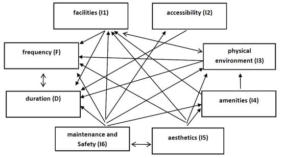 According to the results, I1 (facilities) is the most important factor while I2 (accessibility) has the weakest priorities in the factor set. The weighting results are obtained by normalizing the values of r + y, and the values of r − y show the influence directions among the factors. Accordingly, Figure 2 illustrates the relation map of factors.