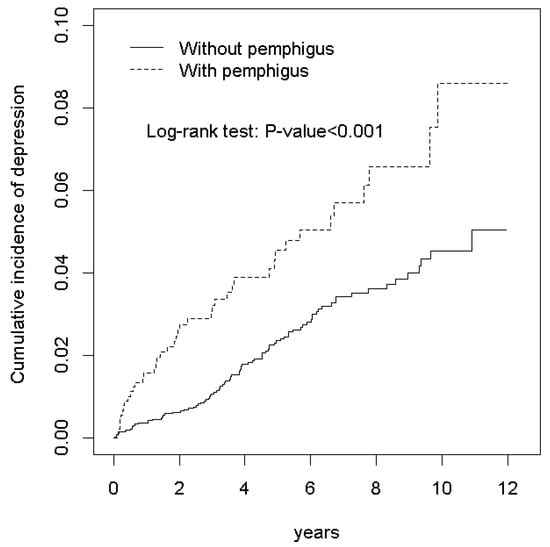 Cumulative incidence of depression between individuals with and without pemphigs.