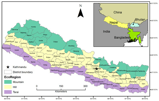 Nepal is situated in the central Himalayan region and it covers approximately one-third of its area. Nepal is surrounded by India in the east, west, and south, and bordered by China in the north. The country is characterized by diverse topography, climate, culture, language, and religion; thus, depicting spatial heterogeneity within a short areal distance (north to south average areal distance is about 200 km). The total area of the country is 147, 141 square kilometers, and, according to the recent census, the total population of the country is about 26.5 million [50].