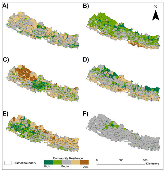 Geographic distribution of community disaster resilience index (CDRI) components: (A) Infrastructure, (B) Economic-Social, (C) Community Capital, (D) Environmental, (E) Caste, and (F) Migration.