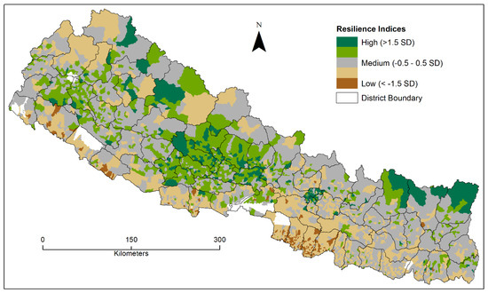 Next, a principal component analysis applying a varimax rotation and Keiser criterion was employed as the extraction method for components. Varimax rotation was chosen to minimize the number of resulting components and maximize the sum of the variances they represent. The Kaiser criterion was applied to extract the number of factors while using eigenvalues greater than 1 as a cutoff for inclusion. Each component theme was generated based on the characteristics of its variables, specifically its dominant variable. All of the component scores were summed to construct the community disaster resilience index (CDRI) for each village and municipalities (3918 village development committees and 53 municipalities). The equal and additive approach was used in the absence of empirical and justifiable evidence for weighting components differently, as has been exercised in similar studies [6,52,58]. The CDRI scores of each spatial unit were mapped while using ArcMap version 10.5 to visualize the most and the least resilient villages in Nepal based on the standard deviation from the mean value.