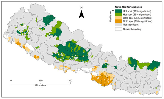 A cluster map of the overall CDRI scores was prepared while using the Getis−Ord Gi* Statistics tool in ArcMap 10.5, depicting the spatial agglomeration characteristics of CDRI across the country. The resulting “Hot spots” indicate that a village had high CDRI and it was also surrounded by villages with high CDRI, and “cold spots” mean that a village had low CDRI and it was also surrounded by villages with low CDRI. The Getis-Ord Gi* Statistics tool generates results of a hot spot and cold spot in 99%, 95%, and 90% significance level. We only included 95% and 99% as clusters of high and low resilience. All other villages with < 95% significance were classified as ‘Not significant’ (Figure 4). Figure 4 shows the least resilient villages are clustered in the central and western Tarai, and the villages with high CDRI scores are clustered in western and far western Hill regions. Districts, such as Arghakhachi, Baglung, Gulmi, Kaski, Lamjung, Myagdi, Parbat, Pyuthan, Syangja, and Tanahun, and capital city Kathmandu, have clusters of highly resilient communities, whereas districts, such as Bara, Parsa, Rautahat, and Sarlahi, have clusters of least resilient communities. Few communities in the eastern and western Mountain have a cluster of highly resilient villages.