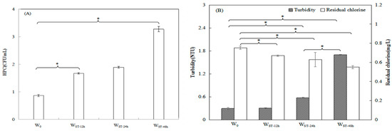 Heterotrophic bacteria plate count (HPC), turbidity and residual chlorine in samples of W0, WST-12h, WST-24h and WST-48h with different STs. (A) HPC. (B) Turbidity and residual chlorine. The values of the bars are the average measurements and error bars are standard deviations of 4 samples collected four times. *Represents P < 0.05.