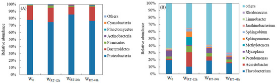 As shown in Figure 2A, a total of six bacterial phyla (average relative abundance > 0.1%) were frequently identified in W0, WST-12h, WST-24h and WST-48h, including Proteobacteria (74.68%–85.57%), Bacteroidetes (10.91%–20.46%), Firmicutes (0.99%–3.26%), Actinobacteria (0.39%–1.48%), Planctomycetes (0.08%–0.69%) and Cyanobacteria (0.08%–0.45%). The predominant bacteria in these water samples were Proteobacteria and Bacteroidetes [17]. In various publications, Proteobacteria were the most predominant taxa in drinking water bacterial communities [18], and members of the phylum Bacteroidetes were also among the predominant bacteria in drinking water [19,20]. In addition, Firmicutes was a major group in the biofilm of drinking water distribution system pipes transporting treated surface waters, and was a minor bacterial group in the biofilm of drinking water distribution system pipes transporting treated ground waters [21]. Other phyla with low relative abundance, such as Actinobacteria, Planctomycetes and Cyanobacteria, have been reported in drinking water [21,22,23]. For example, Kahlisch et al. reported that the bacterial community in tap water was dominated by Proteobacteria, Cyanobacteria and Bacteroidetes, followed by Chloroflexi, Nitrospira, Firmicutes and Planctomycetes. Betaproteobacteria in Proteobacteria formed the largest fraction, with an average of 21% of the total community, followed by Cyanobacteria (16%), Alphaproteobacteria (15%), Gammaproteobacteria (10%), and Bacteroidetes (8%) [17].