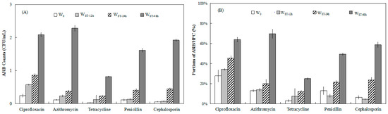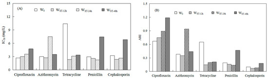 As shown in Figure 4A, the IC50 range for the five types of antibiotics in W0 was 2.7–10.4 mg/L, while the IC50 range in WST-12h, WST-24h, and WST-48h was 2.4–3.0 mg/L, 2.2–7.5 mg/L and 3.4–7.5 mg/L, respectively, higher than the antibiotic concentration range detected in fresh and residential water in previous studies. At present, the concentration of antibiotics detected in pipe network water reported by several countries ranges from 0.16 to 679.70 ng/L [40,41,42]. In addition, it was reported that the concentrations of tetracyclines and sulfonamides were 0.44–2.69 μg/L and 0.97–1.96 μg/L, respectively, in Shanghai’s Huangpu River, China [43]. Hence, the ARB can exist in fresh water and resident water for a long time with low concentrations of antibiotics in pipeline water. Furthermore, the low concentration of residual antibiotics in water can continue to exert selective pressure, and biofilms in the pipeline can also increase bacterial antibiotic resistance and transmission by harboring ARB, or promoting horizontal gene transfer of ARGs among bacteria, which causes and accelerates the appearance of ARB and ARGs abundance [33,44].