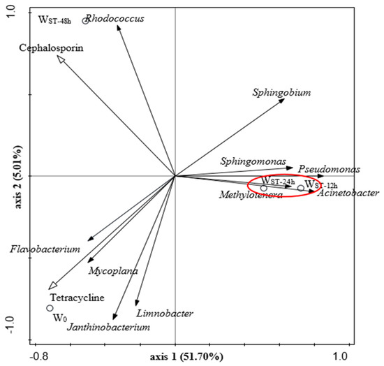According to the RDA analysis of microbial community structure and ARI, the main microflora can be divided into three clusters (I, II, III) (Figure 5). In this study, two environmental variables with statistical significance, the ARI of tetracycline and cephalosporin, were selected for RDA analysis. It can be seen from Figure 5 that the distance between the two short-term samples of WRT-12h and WST-24h was close, indicating that the microbial community structure was not affected by the ST of 12 and 24 h. This was similar to the two short-term samples in the analysis shown in Section 3.2. The distance between the samples of fresh water W0 and long-term resident water WST-12h, WST-24h was great, which indicates that the ST of 12 and 24 h had a significant influence on the microbial community structure compared with W0. This is in agreement with the aforementioned analysis in Section 3.2. In the RDA analysis plot, the correlation of microbes and ARI variables was represented by the cosine of the angle between their arrows. As shown in Figure 5, Rhodococcus in cluster I had a positive correlation with the ARI of cephalosporin, but a weak negative correlation with the ARI of tetracycline. Except for Flavobacterium, Mycoplana and Sphingobium, the genera in clusters II and III showed a weak negative correlation with the ARI of cephalosporin, while Flavobacterium and Mycoplana in cluster II showed a significant positive correlation with the ARI of tetracycline. This is in agreement with the high ARI of tetracycline and the high abundance of Flavobacterium and Mycoplana in W0. The genera in cluster III were negatively correlated with the ARI of tetracycline, and Sphingobium was negatively and significantly correlated with the ARI of tetracycline. In addition, the angle between the ARI of tetracycline and cephalosporin was about 90°, indicating that there was no correlation between them. Thus, this meant that few bacteria in fresh water and resident water were resistant to both tetracycline and cephalosporin.