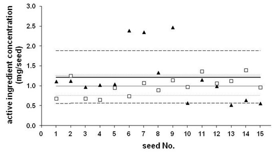 An assessment of the application rates of commercially coated maize seeds (for experimental details see ref [19]) and on-farm (home) coated seeds revealed interesting findings. For maize, the recommended treatment rates range between 0.25 and 1.25 mg AI/kernel [20]. The measured data were compared with the recommended dosages (see Table 1), and insecticide AI content for commercial seeds were generally in accordance of the recommended doses, however doses were lower for earlier commercial seeds (CS series: CS-1 to CS-3) and intentionally lower for on-farm coated seeds (HC series: HC-1 to HC-3). Lower dosages (0.25 mg/seed) were probably applied earlier, but due to the resistance problems, maintaining efficacy gradually required higher dosages, as generally observed for any widely applied PPPs. Higher rates are required also to provide protection against the corn rootworm and billbug, compared to other insect species (e.g., wireworm). Relative standard deviations (RSDs) were typically around 20% for seeds purchased in 2007–2009. Somewhat lower values (around 10%) were observed for more recent seeds (2013–2015), but in a single case (CS-4) a substantially higher (54.3%) standard deviation was determined. Comparing the results measured for an earlier seed (CS-3) and for CS-4 (see Figure 1) both coated with CLO, the ratio between the highest and lowest values were 4.73 and 2.16 for CS-4 and CS-3, respectively. A total of 6 of the 15 seeds were out of the RSD for CS-3, but 7 of 15 seeds were out or near to RSD for CS-4 and 3 of the 7 values were significantly higher than the range based on RSD. Ageing of the coating material as well as the improvements of seed coating technology could play a role in this phenomenon. High differences between application rates (maximum/minimum = 4.73) might influence the local concentrations in soil, thus, the ingredient uptake.