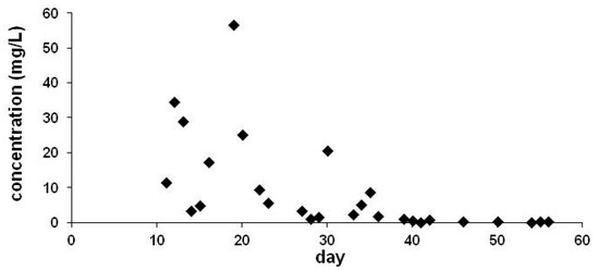 Our investigations [19,33] confirmed the levels reported earlier [31,32,34], but excretion of the guttation fluid was found not be limited to the first 3 weeks after germination. We have detected CLO even on the 45th day after emergence in the guttation fluid collected from plants emerged from coated seeds and grown in the field (see Figure 2). Fluctuation of the measured levels can be explained by the gentle air-flow in the field that results in occasionally intensified evaporation of drops and concentration of the guttation fluid at the leaf tips. Similarly, evaporation is influenced by relative humidity as well, and the extreme values seemed to correlate with both parameters. Thus, exact levels are affected not only by humidity, temperature, growth stage, etc., but also by the local air-flow (breeze) influences the concentration of the ingredients. To compensate for this process, drops were collected always in the same period of the day (between 7 and 8 A.M.).