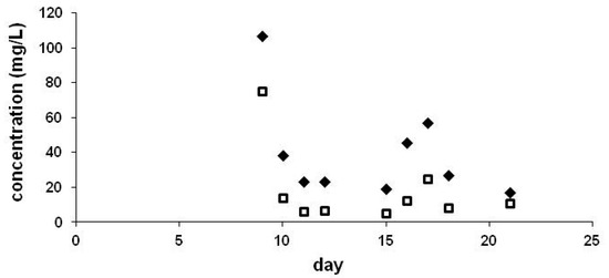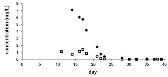 Concentration of CLO (♦) and TMX (□) in the guttation liquid collected at leaf edges of maize plants. Maize seeds were coated by 0.605 mg/seed TMX or 1.217 mg/seed CLO, experiments were performed outdoors in pots.