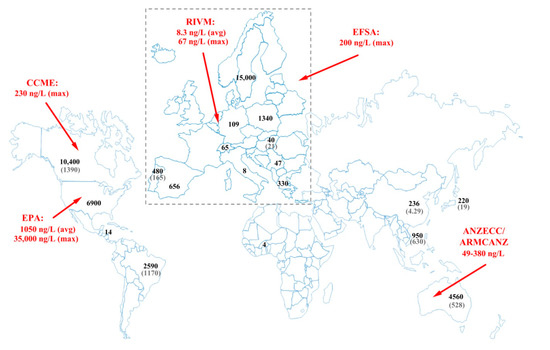 The maximum and the corresponding average concentrations in surface waters reported worldwide. Data are referred in this publication or in ref. [22,39,40]. The indicated quality reference values: European Food Safety Authority (EFSA) no observable effect concentration (NOEC) [41], Rijksinstituut voor Volksgezondheid en Milieu (RIVM) Nederland maximum permissible concentration and long term exposure [42,43], US-EPA aquatic life benchmark [44], Canadian Council of Ministers of the Environment (CCME), water quality guideline [45], Australia and New Zealand proposed aquatic ecosystem protection guideline values depending on species protection goals (80%–99%) [46] and a default guideline value proposed by third parties is under peer review process [47].