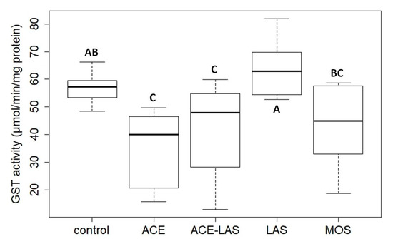 On the basis of our results the toxicity of ACE was higher in GST enzyme activity assays compared to the acute immobilization tests and caused the reduction or inhibition of GST activity. The presence of ACE individually or in combination with LASs resulted in decreased enzyme activity in the exposed groups. The inhibition of GST activity was proven on other test organisms (Eisenia andrei and Apis mellifera) at higher concentrations [77,78] and on D. magna as well after the exposition of other neonicotinoid and pesticide AIs [79,80]. The reduction of GST activity is probably caused by the overproduction of reactive oxygen species (ROSs) as a result of xenobiotic-induced oxidative stress, while the released ROS significantly delay or inhibit the oxidation of substrate [81].