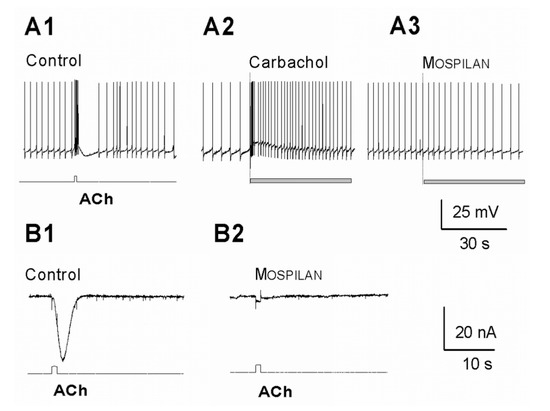 Intracellular responses of the identified Helix pomatia neurons. In normal saline (control) local application of 1 mM ACh evokes strong intracellular response (A1) and carbachol (100 μL, 1 mM) similarly increases the firing frequency (A2), while Mospilan (100 μL, 1 mg/mL) does not alter the spontaneous activity (A3). (B) Voltage clamp recording showing that the ACh-evoked inward current (B1) is virtually abolished in the presence of 0.1 mg/mL Mospilan when applied in the bath (B2).