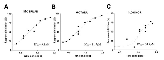 Dose-response analysis of neonicotinoid effects showing Mospilan (A), Actara (B) and Kohinor (C) all inhibiting the ACh-evoked inward currents. X axis: amplitude values in percentage of the control response. Y: Log concentrations of insecticides in molarities of their active components.
